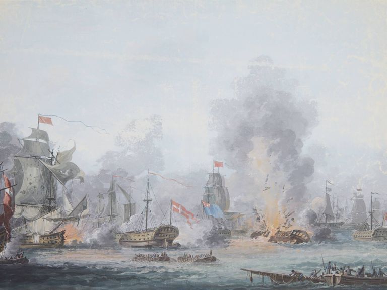 De Slag bij Kopenhagen afgebeeld op een doek. Rechts ontploft de Dannebroge