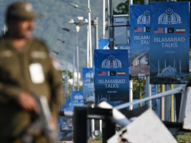 Een politieman bewaakt de zone in Islamabad waar de onderhandelingen waren -
