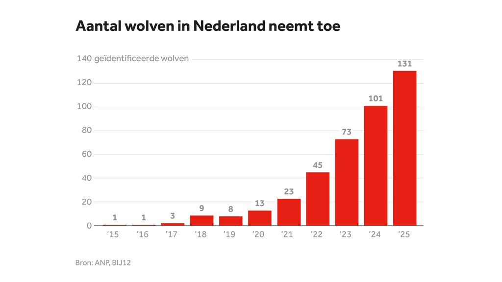 Het aantal wolven in Nederland blijft toenemen. Uit cijfers van BIJ12, de organisatie die voor provincies alle zaken rond wolven in Nederland monitort, blijkt dat vorig jaar 131 verschillende wolven zijn geïdentificeerd. Dat zijn er dertig meer dan in 2024.