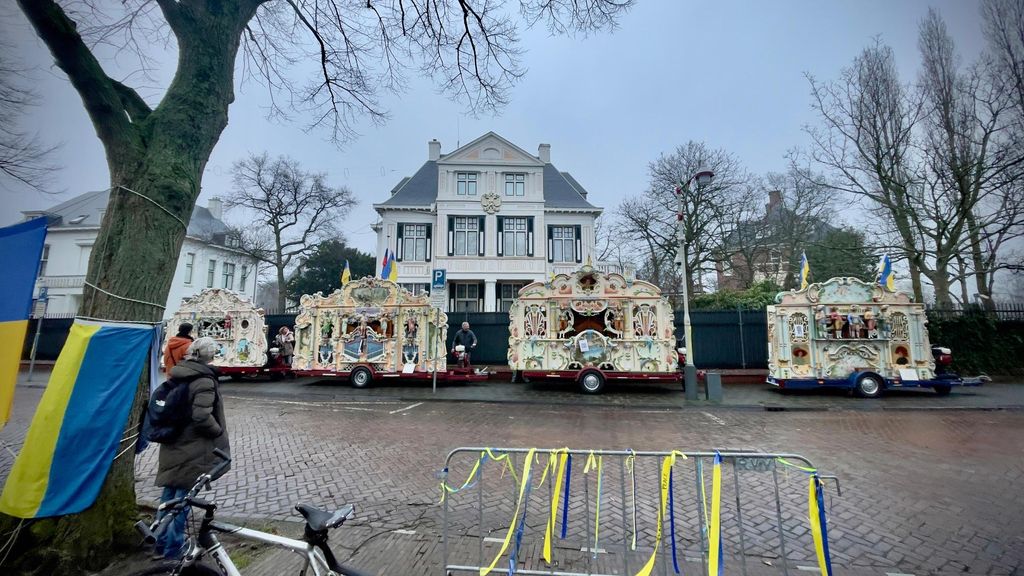 In Den Haag waren vanmorgen een tiental mensen bijeengekomen bij de Russische ambassade om te protesteren tegen de oorlog. Daarbij hield kunstenaar Teun Castelein een lawaaiprotest met draaiorgels, zoals altijd op de dag dat de inval wordt herdacht. Dit jaar had hij er vier laten aanrukken, die door elkaar continu het Oekraïense volkslied spelen.